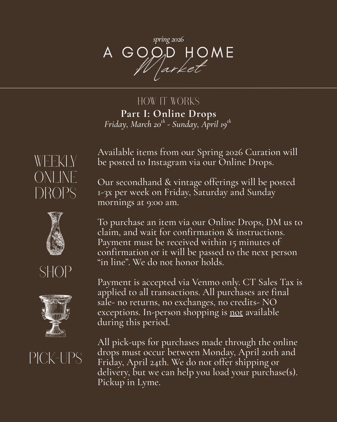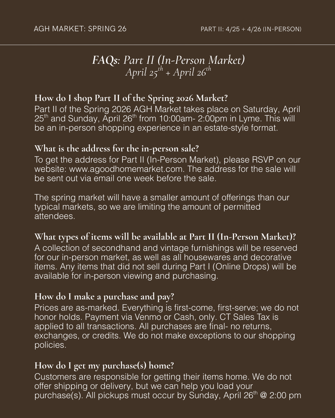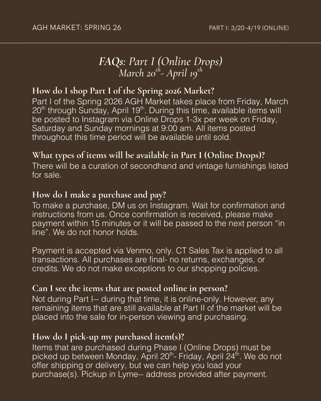 All previews and sneak peeks of the Market will be posted on AGH Market’s Instagram leading up to the sale. We do not offer any private previews or pre-sales.
