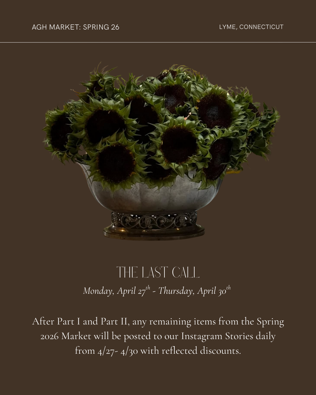 Markdowns will be applied and offers welcomed/considered at the "LAST CALL" sale of the remaining items on the Monday immediately following the sale that takes place on our Instagram.